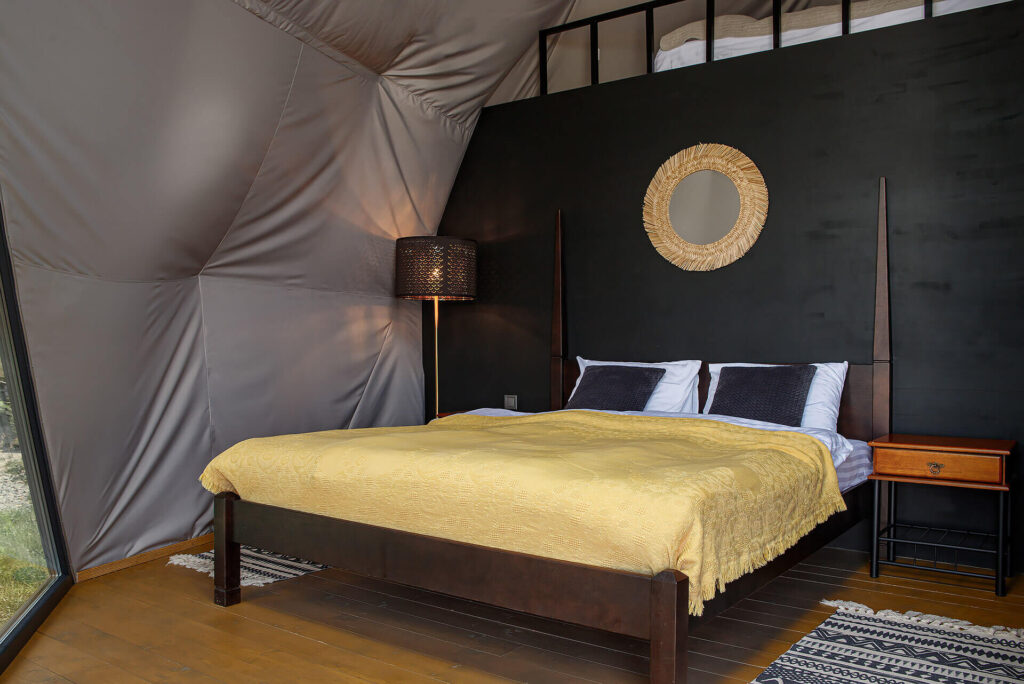 - Затишні та теплі купольні будиночки, крізь скляні двері яких можна милуватися природою навколо. Ніяких протягів, ніякої ночівлі у термобілизні, максимальний комфорт і все необхідне для теплого проведення часу. Погодьтеся, ніжитися у теплій ванні або смакувати гарячу каву, загорнувшись у м’який халат, коли ззовні потріскує зимовий мороз, це окрема насолода.